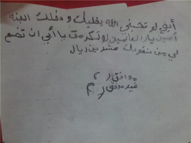 أما طفل آخر فيبدو أنه تأثر ببرامج التنجيم والسحر والشعوذات التي كثرت في الفضائيات العربية فكتب لأهله أنه ملبوس من الجن وحتى يهدأ يجب على أهله شراء لعبة له.